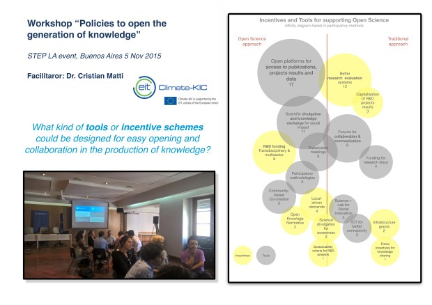 The workshop Policies to open the generation of knowledge was based in participatory techniques aimed to allow jointly identification of a number of items such as tools, methodologies and priorities related to S & T policy. Brainstorming techniques and World Cafe are used to enhance the diversity of perspectives and facilitate the exchange of ideas between different actors. The outcome of this workshop will be digitized and shared with participants to encourage collaboration in different areas.